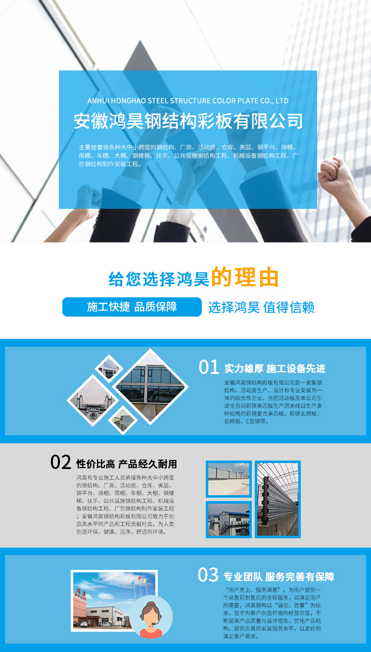 公司致力于創(chuàng)造高水平的產(chǎn)品和工程貢獻(xiàn)社會(huì),為人類(lèi)創(chuàng)造先進(jìn)、健康、潔凈、舒適的環(huán)境。多年來(lái)持續(xù)研發(fā)新型產(chǎn)品。“用戶(hù)至上、服務(wù)滿(mǎn)意”,為用戶(hù)提供一個(gè)從售前到售后的全程服務(wù),以滿(mǎn)足用戶(hù)的需要。鴻昊鋼構(gòu)以“誠(chéng)信、質(zhì)量”為標(biāo)準(zhǔn),以“一切為客戶(hù)所需。不斷提高產(chǎn)品質(zhì)量與設(shè)計(jì)理念,優(yōu)化產(chǎn)品結(jié)構(gòu),提供完善的服務(wù)水平,以更好的滿(mǎn)足客戶(hù)需求。 。
